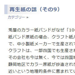 兎屋のカラー紙バンドがなぜ「100%再生パルプ、再生紙」から作られていないのかを、補足説明して置きます。紙バンド原紙の場合、クラフト紙バンド原紙と白紙バンド原紙とカラー紙バンド原紙の3種類ありますが、それらは四国や静岡地区の製紙地帯で、中小製紙メーカーで生産されています。静岡でも四国でもそれぞれ数社といったところでしょうか。