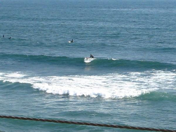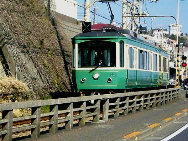 このあたりの国道134号線は、江ノ島電鉄の軌道と平行に走ってるので、時々電車と遭遇します。ゆっくり走っていてのんびりした電車です。そして、反対側は海です。もちろんサーファーがいっぱいです。気持ちよさそう~~