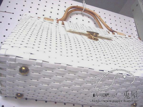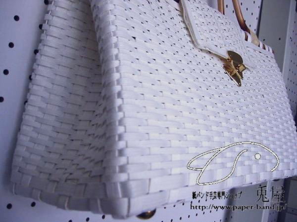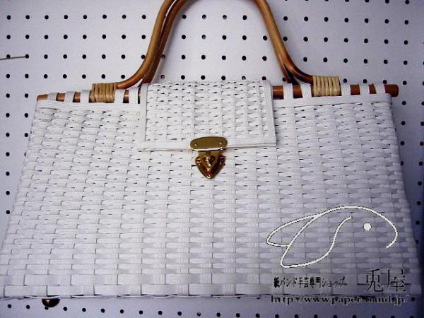 おしゃれなハンドバックに仕上がってます。 このお客さんは去年?だったかな。これと同じようなつくりのバックを色違いでお持ちになっていましたが、今回の 「シロ」 と「木製の取っ手」それに「金色の金具」のバランスが取れていたので、思わず写真を撮らせて頂きました。紙バンド のような気がしませんね。これだと白く染めた革で作ったように見えました。