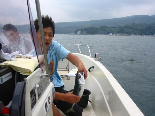 いつもはしらけてる長男ですが、さすがに今日はしらける場合ではないようです。他のメンバーも少しずつ上げながら3時間ほどで終了となりました。私は皆さんの邪魔にならないよう、船の隅っこでニコニコしてました。K君は気を使って「どうです やりませんか?」と言ってくれましたが、魚のぬるぬる、針が掛かったときの苦しげな魚の顔、等が苦手なので、ずうっと断り続けてました。
