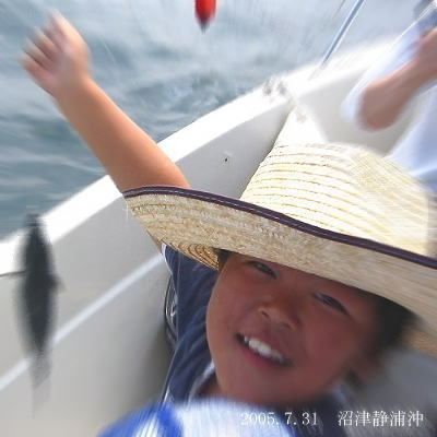 長男は2回目と言っても大好きな釣りで、私の友達もやさしく教えてくれるので楽しみにしていて、当日は5:00起床だったのが、4:00に目覚めてしまい、暇でつまらなくなったので、自宅から1kmほど離れた林に蝉の声を聞きに行ったとの事でした。林には羽化途中の白い蝉がたくさん居たといってました。クワガタ好きの長男ですが蝉の話もうるさくて、箱根を越えて、沼津市に向かう車中ずうっーーーと 蝉の鳴き声の講義をされました。アブラゼミとクマゼミの生息境界線が箱根峠にあるという事を私は初めて知りました。しかも今度は峠を下る途中、道路わきの木を見ていて、クワガタが好む木を発見するたびに、「停まって!」とうるさいので、一箇所だけ車を停めたのですが、その瞬間車から飛び出して行き、道路わきでの昆虫採集は釣り帰りの約束もさせられました・・・。