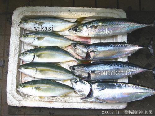 釣りの方はというと、事前に友達から「魚が居なくなってますよ」っと聞かされていたのですが、2週間前のような連続で釣れるという事は無く、静浦沖のポイントを移動しながら釣ってましたが、ソウダカツオばかり釣れるので途中から釣れても逃がしてました。ソウダカツオは生臭いのと、身にムシが付いてるので刺身には向かず、脂ものっていないので味も今一です。ウチは記念に3匹持って帰り全部竜田揚げにして食べました。サバもよく釣れるのですが、やはりこの時期ムシが付いてるのと、時期はずれで脂が乗っていない為、コチラは1匹だけ持って帰りました。