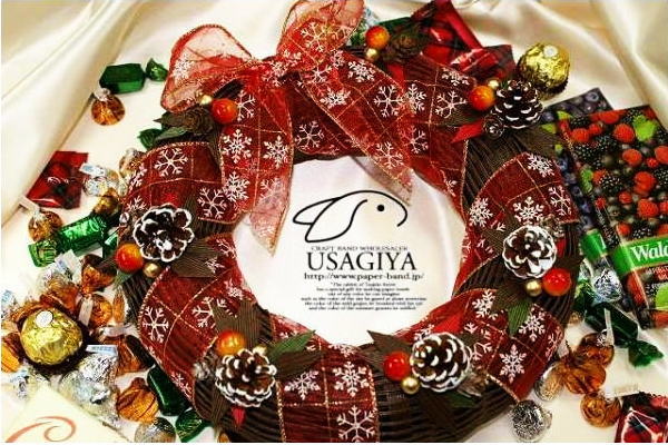 この時期当然ベースは、コレクションカラーの「ちょこ色」です。リボンを掛けると、チョコレートの雰囲気がそのまま楽しめます。 こうやってお菓子のイメージで作るのも楽しそうです。「かふぇおれ色」で作ればモカの雰囲気が出るでしょうね。飾りもお菓子用の物を利用するのもいいかも♪それから・・カラフルな色でたくさん作れば、キャンデーのリースが・・・・!