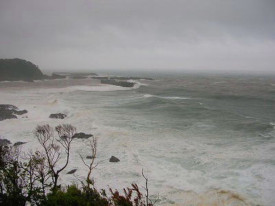 翌日は全国的な荒れ模様で高知県も風雨ますます激しくなってきます。しかし予報で私がこれから向う西部は午後から天気が回復すると言っていたので安心して3時間ほど走り、黒潮町(旧 大方町)で太平洋を見ながら休憩した時の写真がこれです↓。雨は小降りで、風は生ぬるく、波は激しく、色は薄黒く、まるで動く墨絵のように迫って来ました。これも風の仕業ですね。黄砂の風より、墨絵の風のほうがいいや!