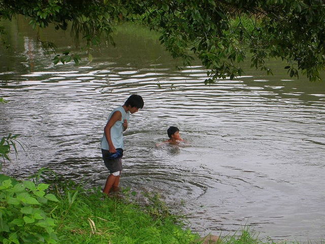 通りすがりの村の人たちは「ギョッ」っとして見てました。(だってこんな事してるのウチの子だけだもの)が、すぐにニコニコして手を振ってくれました。時々次男の足に川の魚が食いついてくるようです。その度にまた大きな声でギャーギャー騒ぎます。
