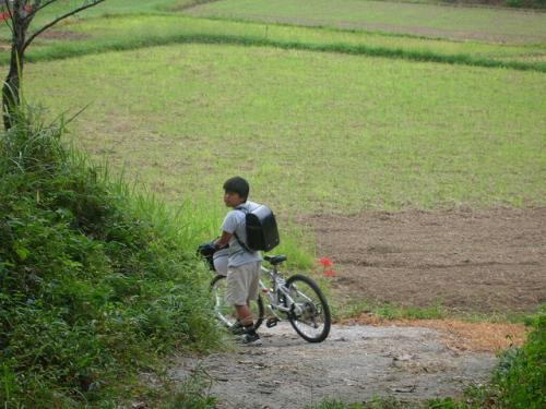 今週のある日、小学校5年生は学校近くの田で、稲刈り体験が有りました。その為その日は自転車通学が認められました。いつもはグズグズの小5男子ですが、自転車好きの彼は、通常より30分も早く起きて準備をし、あっという間に飛び出して行きました。稲刈り体験なんてした事が無い私は、ちょっとうらやましく思いながらせっかくの朝なので、登校風景を写真に収めて置きました。