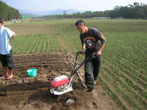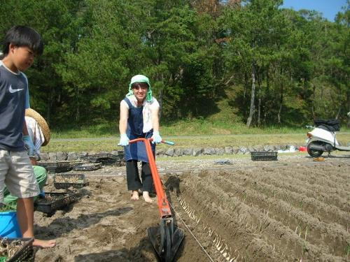 ラッキョ植え付けとは特に関係はありませんが、畝を作る前に、管理機(耕運機の小さいもの)であらかじめ畑を叩いて置くと(耕して置くと)畝がきりやすく、また、水分がうまく行き届いて畝の崩れ防止になります。という事で、管理機にも挑戦しました。なんかオートバイのハンドル見たいです。意外に振動が強いので、コレを1時間も使ってたら手がおかしくなりそうです。肝心のラッキョ植え付けは昼前には終了しました。家族でいろいろ話しながら、こうやって農作業をするという事が、幸せの一つの形かなぁと思いながらの半日でした。
