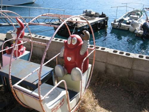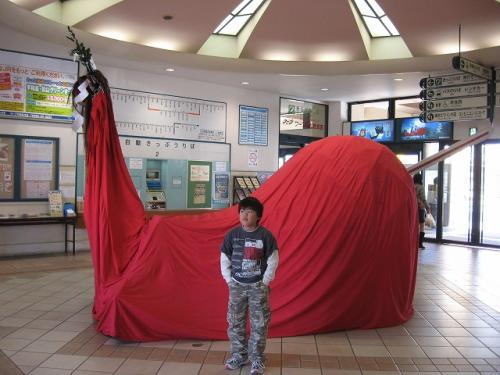 奇跡的に残っていた赤松遊園地の風景に気を良くし、お腹もすいたので市内に入り車を駐車場に入れます。なんと駐車料金の安い事か!30分=50円です。駅前の一等地でこの値段、これなら何時間停めても安心です。という事で先ず駅に用足しに行き、ふとロビーを見ると「牛鬼:ウシオニ」がいます。「牛鬼」とはお祭りの山車で、宇和島市を中心とした宇和郡のお祭りには必ず出てくる怪物です。顔は鬼、体は大きく首は長く、尻尾は剣です。骨組みは竹を組み合わせて作り、赤や黒の布、時には棕櫚の皮をかぶせて胴体とし、顔の鬼面に御幣をつけることで、鬼の恐いイメージから一転して悪魔ばらいをするようになっています。
