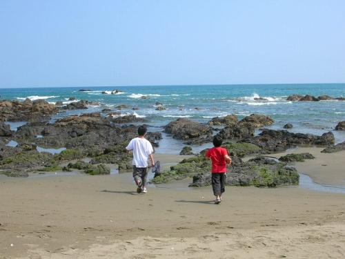 次に向かったのは黒潮町の海岸です。黒潮町は4kmの砂浜が有名ですが、その並びには磯も有ります。そこで磯遊びをするのが第2の目的です。国道沿いに車を停めたと思ったら、やっぱり長男が先に飛び出して行きました。静岡県に住んでいた時も、神奈川県に住んでいた時も、明日が休みで煮詰まりそうと見れば潮見表で大潮干潮を確認し、頃合が良ければ装備をいろいろ持参して磯へ向かいました。子供達が小さい頃からよくやっていた家族行事です。