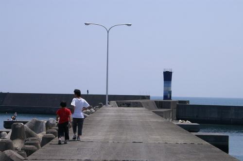 この辺りから足摺岬まではサーフィンのメッカでこのテント村状態は黒潮町から足摺の大岐海岸辺りまで、ポイント毎に同じだそうです。ところが入野漁港について見ると人気が有りません。写真でも遠くに人影が見えるだけで後は私達一家だけです。で、さっそく子供達は堤防に向かって走って行くと魚の状態を覗き込んでいます。この日は夕方まで堤防で遊んでいました。