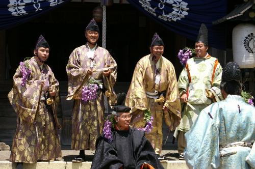 かわいらしい童女の行列。みんな手に藤の花を持っています。