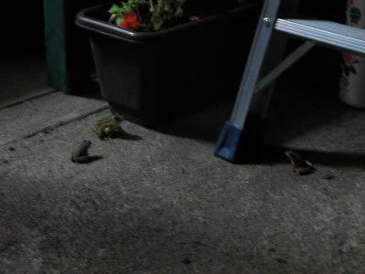 トノサマガエルやアオガエル、ヒキガエル等です。目的はもちろん捕食で、虫が群がっている中にのそのそ入って来たものですから、特に狙って食べるという風ではなく、片っ端から食べまくっています。これは写真に取ろうと玄関外に出て見ると、なんと玄関の外にも2~3匹のカエルが来ていました。昨夜の湿った天気が関係してるのかはわかりませんが、一斉に集まって食いまくってるのを見るのは不思議です。