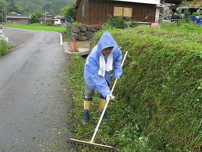 部落行事には、正月過ぎの初会(部落民全員の寄り合い会議)、部落内清掃、祭りなどがあり、今年からもう1つ増えたのが「県道整備事業」による草刈りです。
