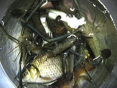 実は来月東京から友人が遊びに来るのですが、その友人の事を長男も次男も大好きなので、「前田さんの為に沢山エビを採らなくちゃ!」という気分も重なり、久し振りの採集になったのです。それを見ていた次男も家内と一緒に別のエビポイントへ向かいました。コレが昨夜の事です。まぁこれも有りでしょう。コレは恐ろしい事ではありません。