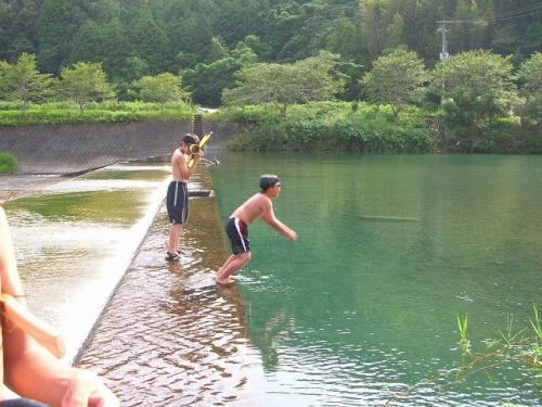 - 右写真 移住後一ヶ月もしない内に東京の友人親子が来てくれました。/後川での川遊び。