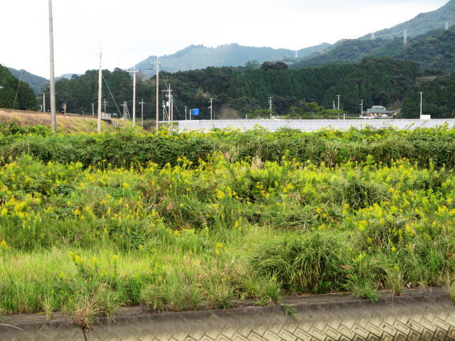 折角の休日なので、いつもとは違ったルートを歩きたいと思い、まず小学校まで車で行き、学校の脇の空き地に駐車し、川沿いに下って行く事にしました。で、土手道路に入ると一面セイタカアワダチソウが咲き乱れています。出張に出かける前は彼岸花が沢山咲いていた所に、いかにもアメリカ大陸からやって来たぞ!見たいな勢いです。