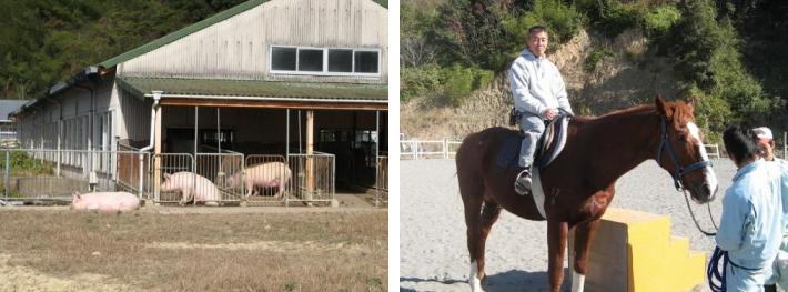 行列を横目に向かった先は畜産棟、豚が同じ方向を向いて昼寝していました。(立って寝る、座って寝る、寝ころぶ)あと、最近入ったジャージー種(牛)を探しましたが見当たりませんでした。幡多農馬術部で体験乗馬が出来ると長男から聞き私も初めて馬に乗って見ました。馬の名前はボジョレーと言いおじいさんです。乗って上から見て馬の首が長い事を知りました。これで飛ぶなんて!