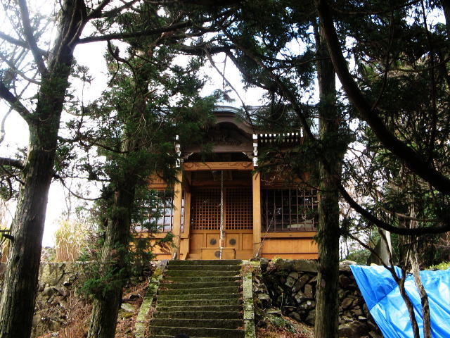 神社裏の空き地には見晴らしの良い岬が有り、そこから何回も「ヤッホー」を叫びました。遠くに宇和島湾に浮かぶ九島が見えました。