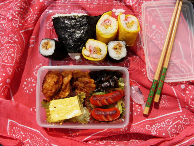 右:我が家の定番お弁当。赤いウインナーと卵焼きは昭和の象徴ですよね。