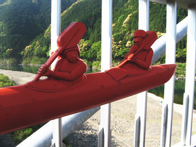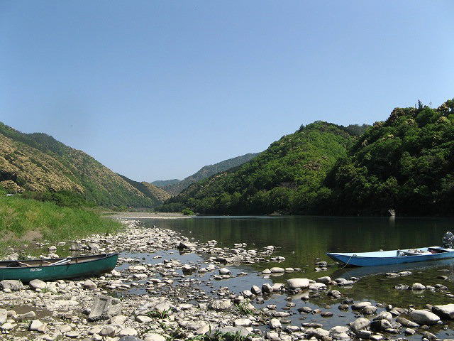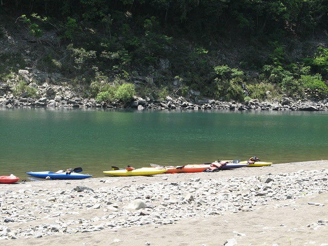 集合は四万十市(旧西土佐村)江川崎にあるカヌー館に8:00。今日は愛知県のご家族と熊本県のカップルの計6人の方を引率して、下流の四万十楽舎前までのコースです。ゆっくり下りながら、途中お弁当を食べ、たっぷり四万十カヌーを楽しんでもらうツアーです。私は先月カヌーデビューを果たしましたので今日のコースは大体わかっています。先月はちょっと肌寒い日でしたが、今日は絶好の五月晴れ、と言うかお昼頃の河原は 夏 でした。