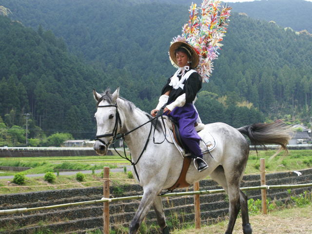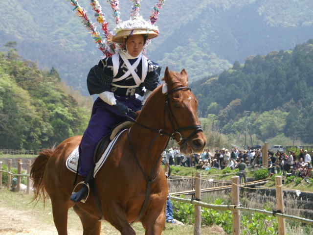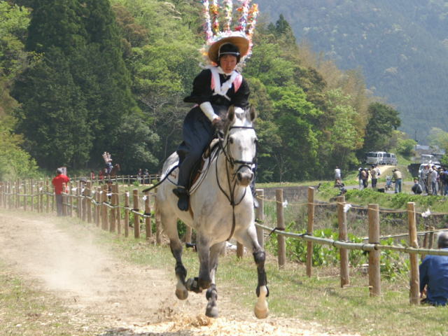 先月(4月26日)高知県幡多郡三原村で「上げ馬神事」が行われました。この行事は久しく途絶えていたのを、数年前地元三原村の方々がご尽力されて復活したものです。「上げ馬」なので当然「馬」の出番なわけで、行事の馬の部分を仰せつかっているのが、幡多農業高校馬術部であります。去年長男が入部し一番最初の行事がこの行事で、1957式に乗って見に行った事を思い出します。まだ入部したての長男達1年生は専ら馬と先輩のお世話係 でしたが、今年はスカッと走ったようです。ようです・・・・とは?その日は関西出張と重なり見物に行けなかったのです。なので、写真だけ見て雰囲気味わっています。