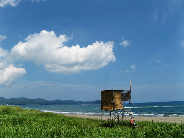 私が入ったのは誰もいない遊泳区域、遠くの海岸ではサーファーが波乗りしているのが見えるだけで、私一人の為に監視所にいるおじさんも寝ころんでいます。今日から夏休みですが、子供達も来ていません。一人で遠浅の海岸で遊んで、「さて仕事仕事」あまり長居をすると昼寝をしちゃいそうです。さっき事務所を出て海で遊んで事務所に帰るまで、10分でした。