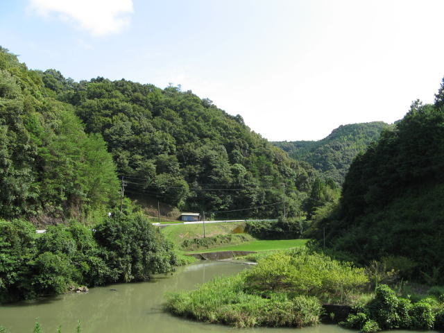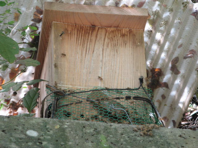 と言う事で朝からの激しい雨が止んだので、「ゲリラ豪雨」のイメージを払う積りでウォーキングに出ました。(あれは「ゲリラ豪雨」じゃない、ちょっとした夕立ち見たいなものだったのさ・・・・)裏の丘を越えて県道に出て川沿いに歩きます。途中で見つけた蜂箱のニホンミチバチは思ったより色が地味でした。同じ蜂箱をもう一度帰りに観察しましたが、スズメバチ(幸いな事にオオスズメバチではありませんでした)が一匹寄って来ていました。ニホンミツバチにとってスズメバチ類は天敵です。スズメバチが近寄る度に、巣の前に固まっているニホンミツバチの一団が同じタイミングで羽をはばたかせています。すると一団が光るような効果が生まれ、スズメバチが退くといった光景が幾度も繰り返されていました。テレビで見た事のある情景を実際に見る事が出来ました。小さなニホンミツバチの健気な行動に感動しました。