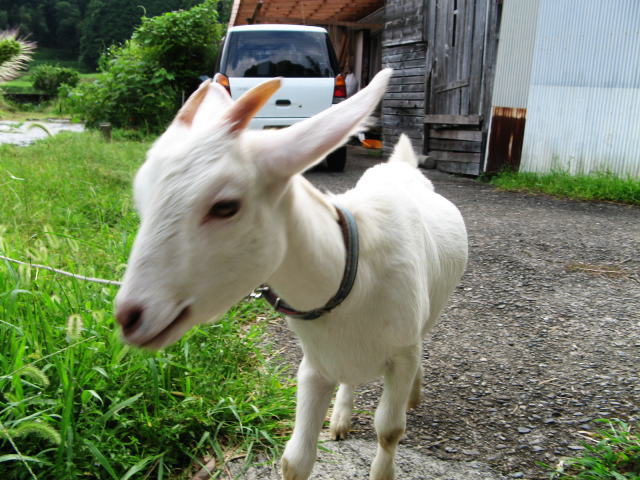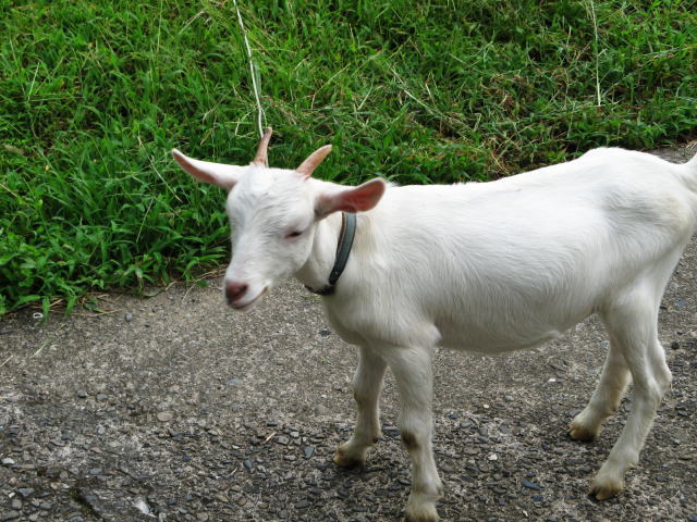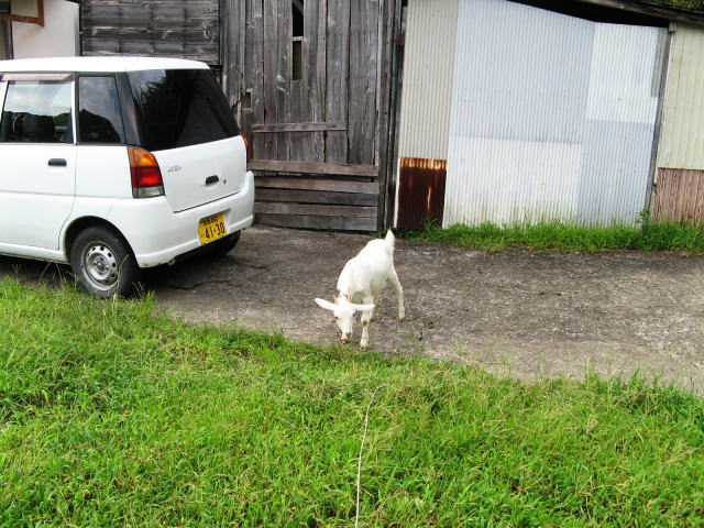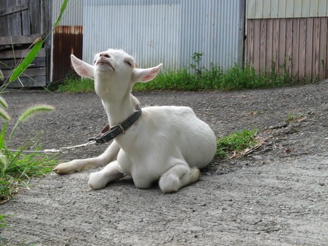 ヤギを飼い始めて3か月半(2008年5月25日から飼い始めています)この半月ほどヤギの散歩を自粛しています。理由は私が出張に出る事が多く、私が留守の場合家族の負担が大きくなる(誰が散歩に連れて行くのかという事です)ので、8月に東京出張から帰って来たら、既にそのような決まりになっていました。はじめは「散歩に連れて行け~メェ~」と泣いていたそうですが3日もすると自分の小屋と庭(ヤギエリア)で静かに草を食べているようでした。しかし私の帰宅を知ると、ヤギの様子が一変し、「メエ~ メエ~ メエ~ 私は閉じ込められている助けて~」騒ぐようになりました。でも、ここは我慢。3日ほど鳴いていたと思ったら境遇に慣れたのか、今はマアマア落ち着いています。