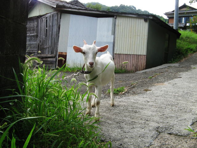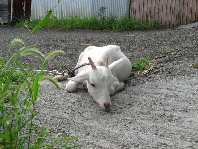 ヤギの一日の内、起きている時はほとんど食べています。ヤギを飼い始めた頃はどんな草が好きなのか?どんな草を与えれば良いのか?わからず、ヤギと散歩しながらヤギの食べる草を覚えていました。中でも「アキノノゲシ」は大好物で、たぶんヤギにとって、「アキノノゲシ」はお菓子だと思います。この草は比較的群生している事が多く、無い所には影も形もありません。そこで自宅の周りに「アキノノゲシ」を移植して備えるような事もしましたが、最近は昼間はヤギエリアから出し庭のあちこちに繋ぎっぱなしで、適当な草を自由に食べて貰っています。時々は「アキノノゲシ」や「クズ」などを採ってやりますが、お陰さまで今日までヤギのえさ代は0円です。さて冬はどうなるんだろう・・・・。だんだん涼しくなるにしたがい、それが気になっています。
