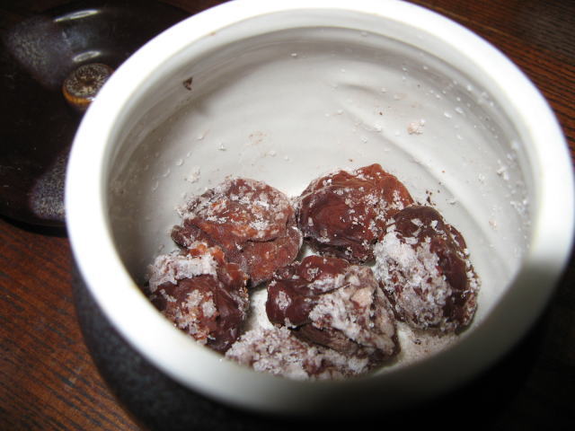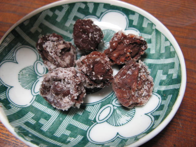 同じ集落に住むMさん(大家さんとは違う人:うちらの集落にはM本姓が多いのです)と最近仲良くなっていて、この間Mさんの家の庭で二人で飲んで居ました。その時、私が「焼酎のお湯割りを下さい」と言うと、古い梅干しと新しい梅干しを持って来て、Mさんが「ちょっとこれ」と言って説明してくれたのが100年以上前の梅干しです。