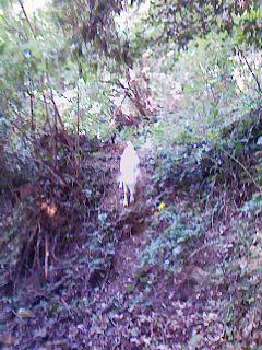 いつもの雰囲気と違った山道に入ったので、私についてくるヤギの歩き方も弱々しいです。山道と言っても、ほとんどうっそうと茂った森の中、しかも今は使われていない廃道を歩くので、ヤギにはちょっと無理かな?とは思ったのですが、これも経験という事でどんどん中に入って行きました。一応私にとっては3度目の道でも有ります。(そのウチ1回は夏のため植物の繁茂がものすごく、途中で断念しました。)