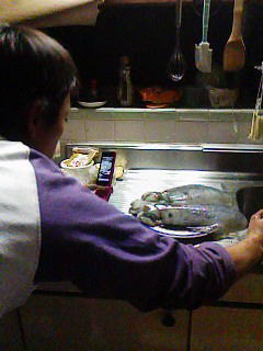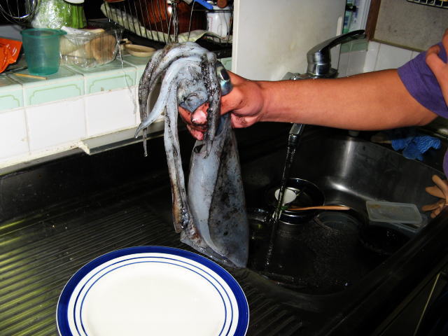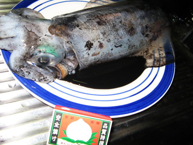 で、私はパソコンで遊んでいた所40分位して帰って来ました。(今夜は40分か)あまりに寒いので早めに退散したのかな?と思っていると「アオリ2ハイ釣ったぞ」と言いながら入って来ました。何!イカ2ハイ!すごいじゃないか!と言う事で私はブログネタの為にカメラを持って台所で構えます。長男はあれこれ私に説明しながらイカの墨を出したり、写真に撮り易いように並べてくれたり・・・・