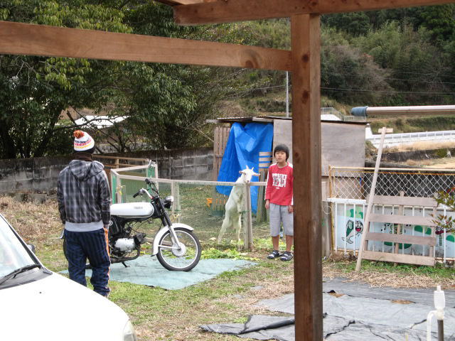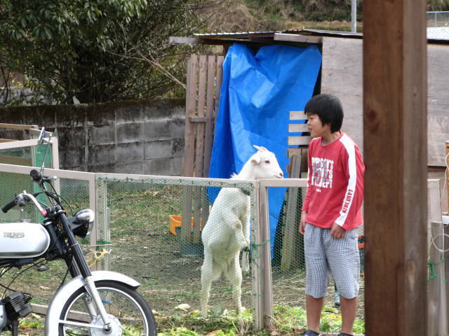 【ヤギ】2008年6月、いろいろ事情が有ってウチに来ました。(まだ生まれて10ヶ月の雌です)一時は鳴き声に悩まされた時も有りましたが、こちらもコツをつかんで来たので、なんとかうまく行ってます。考え方によれば「犬」を飼うより全然楽ですが、都会など家屋密集地帯では無理だと思います。ヤギを飼う人はあまりいませんし散歩をする人はさらに少ないと思いますが、ウチではペットして飼っているので、散歩は飼い主のたのしい権利として時々気が向いた時に行使しています。