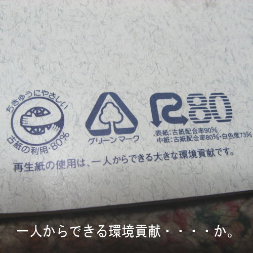 まぁどこの業界も強い弱いのバランスで動いているのはわかりますが、許せないのは、再生紙など「エコロジー」に関わる仕事に目をつけた有象無象の団体です。