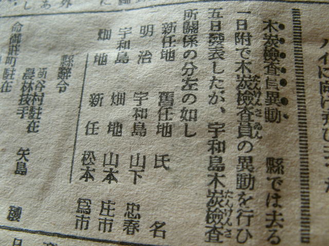 ・・・木炭檢査員異動 縣ではさる一日附で木炭檢査員の異動行ひ五日発表したが、宇和島木炭檢査所關係の分左の如し・・・
