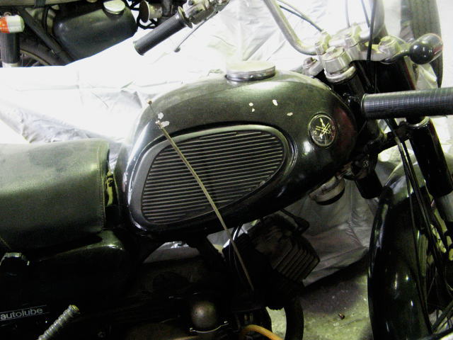 で奥にはK君と息子のS君がいじっているオートバイ単車があります。渋いK君の影響でS君も古い日本車(2輪&4輪 )やメンドクサイ古いハーレーが好きになったS君は、オートバイの免許を取った暁にはピカピカのレーサーレプリカのようなバイクではなく、昭和エレジーな鯨タンクの日本製単車に乗りたいそうで、コツコツ直しているのです。今どきの17歳とは思えない所業は、Kガレージにやってくるハーレーおじさん達の興味の的になっています。一方・・・・