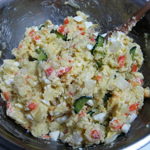 まず、ジャガイモとニンジンを皮ごと茹でて、同時に玉ねぎときゅうりを塩もみし、茹で卵を作ります。20代自炊時代に作った時は何も見ずに想像だけで作り、多めの茹で卵がいい感じでしたが、玉ねぎの扱いに疑問が出たので、クックパッドで「基本のポテトサラダ」をチラリ見しました。まぁポテトサラダは見た通りなので大体でいけますね。で、ジャガイモをつぶしながら思いました。これってコロッケ作りの下準備だよなぁ・・・あとは食べるだけそれにしても30年振りのポテトサラダ作りって、生き延びた感があるなぁ・・・・(爆)