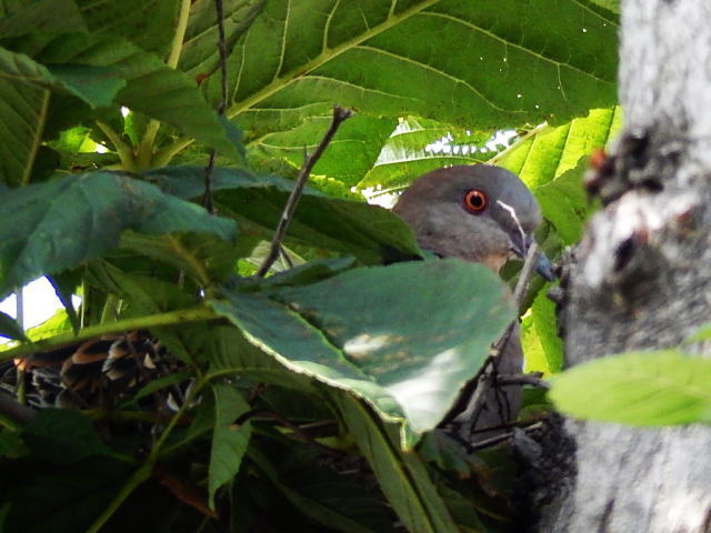 食事を済ませ歩道に出て見ました。見上げると巣のようなものが見える・・・・!オッ ヤマバトが一羽こちらを見ています。ヤマバトはツガイの場合が多いので、この鳥はさっき何回も往復していたヤマバトのつれなのでしょう。