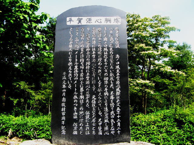 ・・・・・・・・・・・・・・・・・・・・・平賀源心胴塚歴史及び伝説海ノ口城主平賀源心成頼は天文五年十二月二十八日に武田信玄の奇襲にあい戦死した。不落を誇り武田氏をなやました海ノ口城は信玄十六才の初陣の手柄により遂に落城し源心の遺骸がこの場所に埋められていると伝えられている。又甲斐国志古墳の部には平賀源心正覚寺に牌立す。元信院求堅大居士とあり、山梨県若神子村の路傍に平賀源心の墓がある。伝説によれば首実検のため首だけ持ち帰り若神子に葬り胴はこの地に埋めたと言う。高さ約一メートル直径約四メートル位のつき山は、何万個という石が旅人により供えられている。平成元年四月南牧村百周年記念・・・・・・・・・・・・・・・