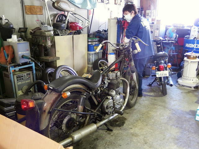 工場ではK君の長男が何やら怪しいイギリスのオートバイをいじっていました。↓