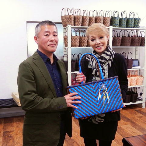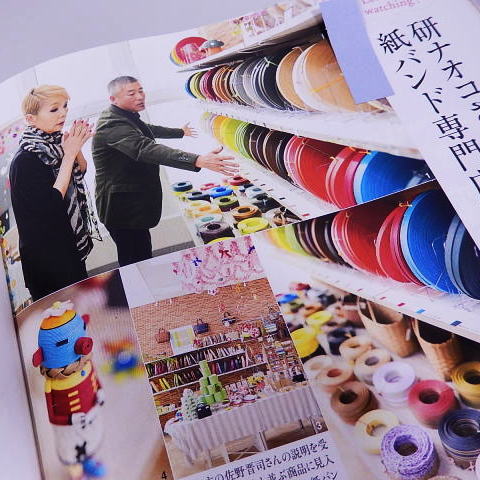 午後3時前、研ナオコさんと出版社の方が来られ緊張してのお迎えでした。研ナオコさんは店に入られるとすぐに紙バンド陳列棚に直行され、あれこれ手に取って見たりサンプル作品の幅を計ったり目を数えたりされ、私はタイミングを計りながら紙バンドの説明をたっぷりとさせて頂きました。(写真の顔が赤いでしょ!これ頭に血が上っているんですよ)