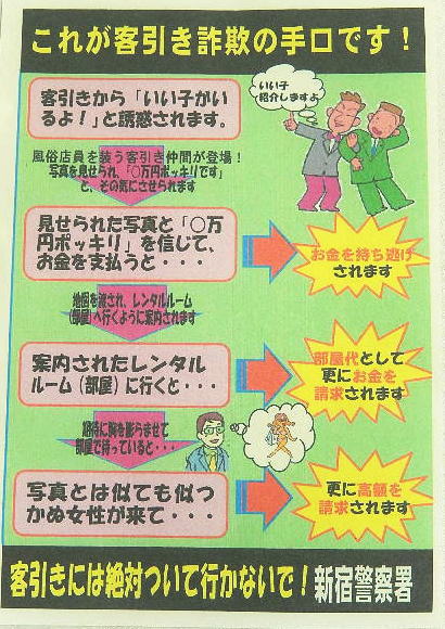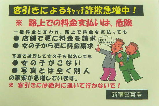 昨日の夕方、歌舞伎町を歩きよったら狭い通りにパトカーが赤色灯を点けて停まっとる。しかも道の真ん中に・・・・そして周りにはお巡りさんが数人おって、チラシを配りよります。サッと差し出された時はいつもの反応で体をひねってチラシを避けましたが、お巡りさんの配るチラシに興味もあったので、別のお巡りさんに近づき貰うたのがこれ