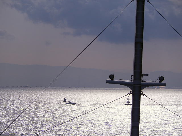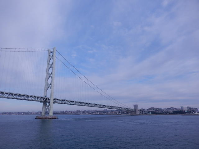 船室で寝ていると放送がありました「・・・・明石大橋・・・・」どうのこうのと言ってます!そうか!と言う事でカメラをもって船の展望台へ。そういえば10日ほど前に橋の根元のJR舞子駅今回の便は小豆島に寄る便で、小豆島観光の方が多く見られました。私にとって小豆島はあまりなじみがありません。でも紙バンドのお客さん沢山いるんですよ。