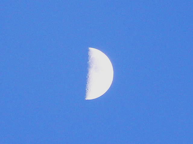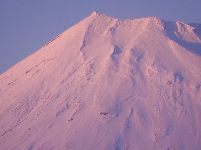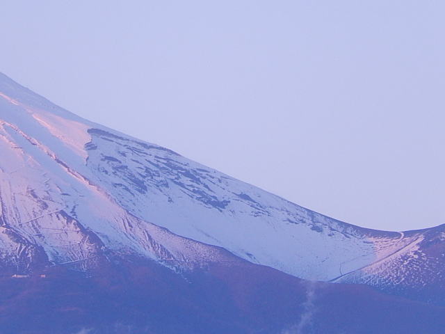 冬の晴天の夕方、真っ白い富士山に夕日があたり、まだ青い真上の空には白い半月が見える・・・・のでした。贅沢なことです。