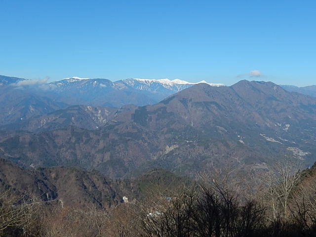身延山久遠寺のロープウェイに乗って山頂奥之院駅まで7分。奥之院境内はこの時期「ヒヤイ」です。でも快晴の展望はかなり良く、境内三ヶ所の展望台からはそれぞれ趣の違った景色が楽しめます。まずは天守山脈の向こうに見える富士山と、手前の富士川の景色を楽しんだら、迫力がある北側展望台の方へ向かいます。