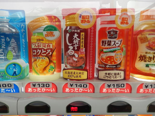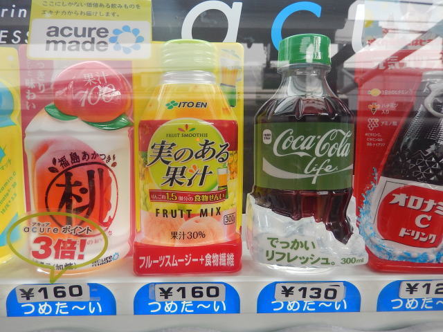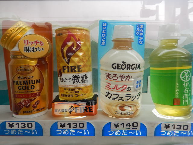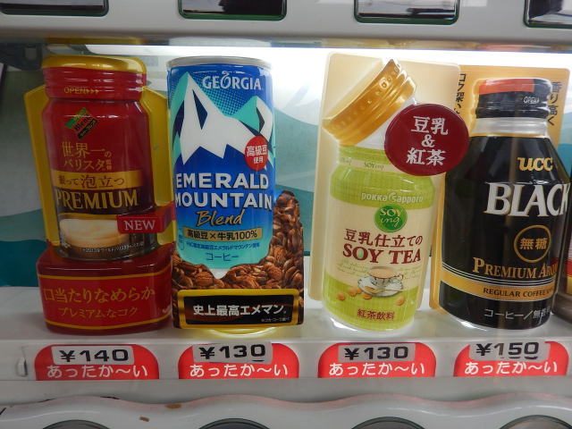 改札の外にはコーヒー店があるけれどそこまでして飲む気もないし、ひょっとしてプラットホームで飲めるかな?とホームに降りたけど、自販機しかない・・・自販機の缶コーヒーは苦手なんです。電車も来ないのでしばらく自販機を眺めていました。なにやら面白い飲み物がありますなぁ・・・・・