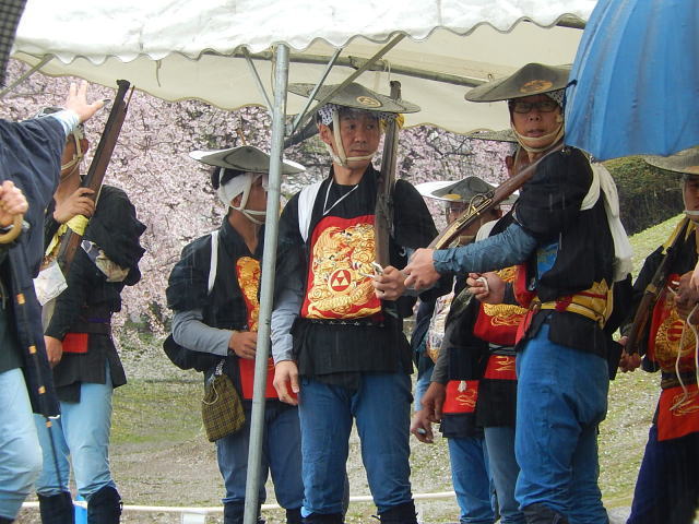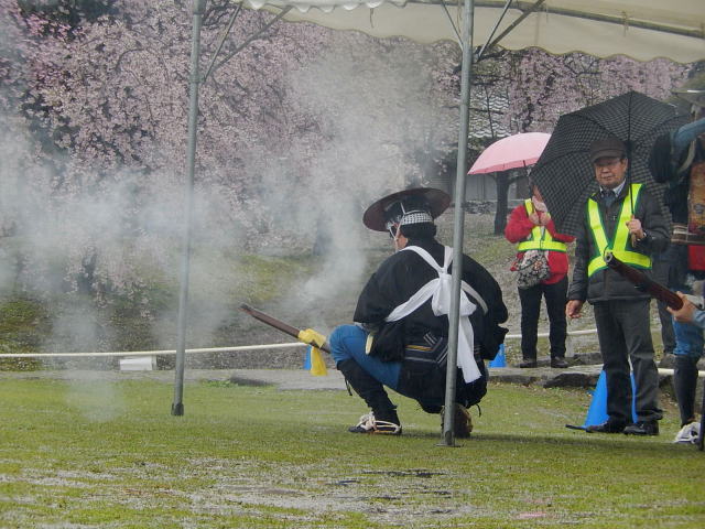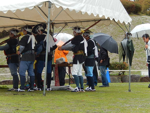 雨の公園を適当に歩いていたら、おっ鉄砲隊がいます。雨が降るのであまり元気がありませんし、お客さんも少ないです。私は最前列でその時を待っていました。あぁ雨かぁ・・・・雨を吹き飛ばして迫力の絵を期待していました。