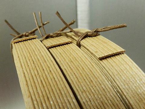 でも、中には色を求める人もいたらしく、どうしたかと言うと、あとから直接色を「塗った」のだそうです。クラフト紙の梱包用紙バンドに色を塗るのはとても難しいというか、糊の層があるので、きれいに塗れない・・・・しかし、「塗った」のだそうです。