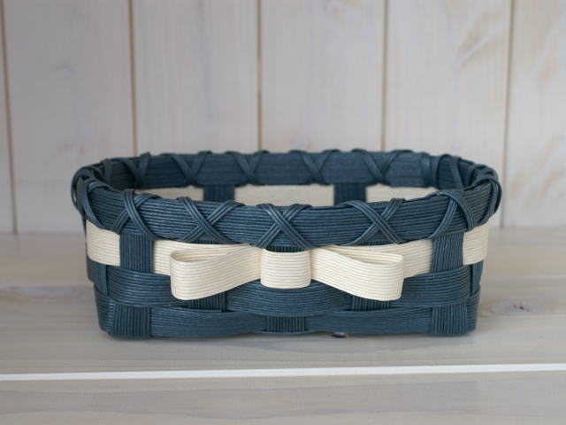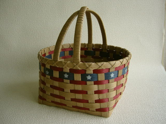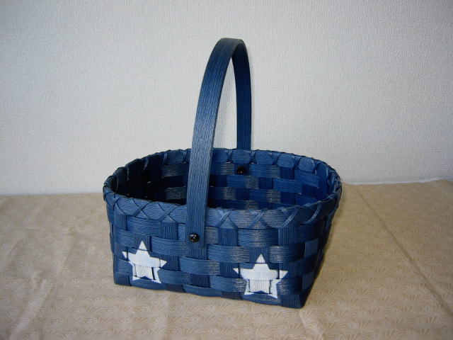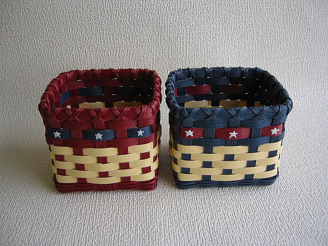 「あい」がなかなかいい感じです。特に「あい」単色の大き目白星カゴは、カントリー雑貨店に飾ってあった木製カゴをヒントに作ったもので、取手は紙バンドを何枚も重ねて「木」のようにカチカチにし、木ねじで取手と本体をつなぐことでカントリー感を出していました。そして大きな白星はあり合せの材料でステンシルをしています。