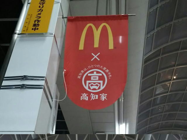 3時間ほどワァワァやってたら疲れて来たので、10時には解散・・・・帰りの帯屋町商店街のアーケードを見上げたら????マクドナルドと高知県が一緒になんかやりよりました。